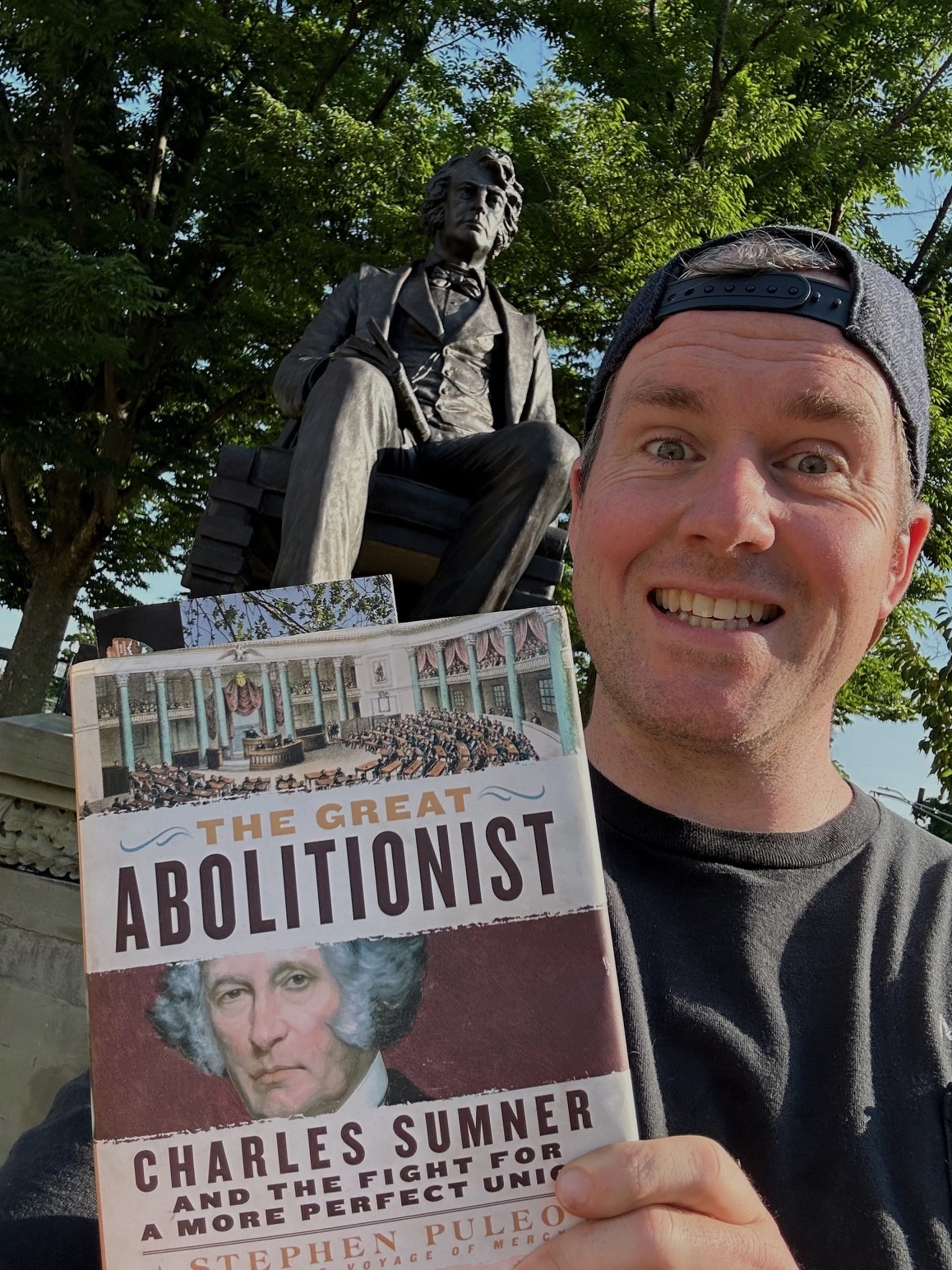 This was one of my favorite summertime photos! Thanks to my nephew, Jackson Keohane, who was reading (and enjoying!) The Great Abolitionist, for grabbing this “Sumner-over-the-shoulder” photo while he was traveling through Harvard Square in Cambridge. The Sumner statue behind Jackson is prominent and not far from the entrance to Sumner’s alma mater. Thanks, Jackson!