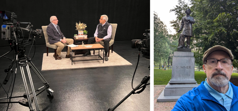 Some of you may recall that the very first time I spoke publicly about the book – even before it came out – was on Abington (MA) Community Access and Media’s show, “Author Talk,” hosted by Jim Dorman and directed by Kevin Tocci (the photo of the set is shown here). At the time, Jim told me he hadn’t yet visited Charles Sumner’s statue in Boston’s Public Garden, but looked forward to doing so. Well, Jim finally made it earlier this month, and he sent me this selfie in front of the statue. Glad you found it, Jim! By the way, if you’d like to view that broadcast from more than a year ago, the link is here.