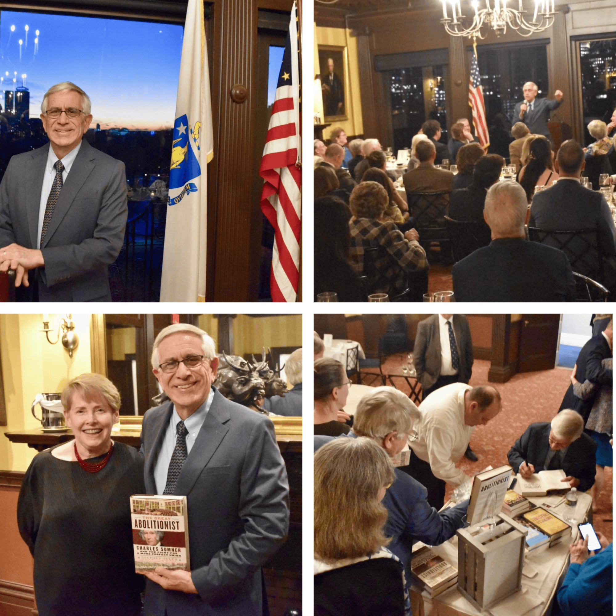 With the downtown Boston skyline as a backdrop, I was honored to speak about The Great Abolitionist at the prestigious Union Club’s annual Lincoln Birthday Dinner, where approximately 80 attendees enjoyed an evening of history and good conversation. The Union Club was established in 1863 by prominent Bostonians who expressed full-throated support for the Union cause during the Civil War – U.S. Senator Charles Sumner, the subject of The Great Abolitionist, was among its members! I’m shown here with Maureen Marcucci, Chair of the club’s Civil War Committee, and one of the key organizers of the event. Thanks to my wife Kate for handling book sales, and my sister-in-law, Pat Doyle, for the photos – and of course, to the Union Club for inviting me to this fantastic evening!